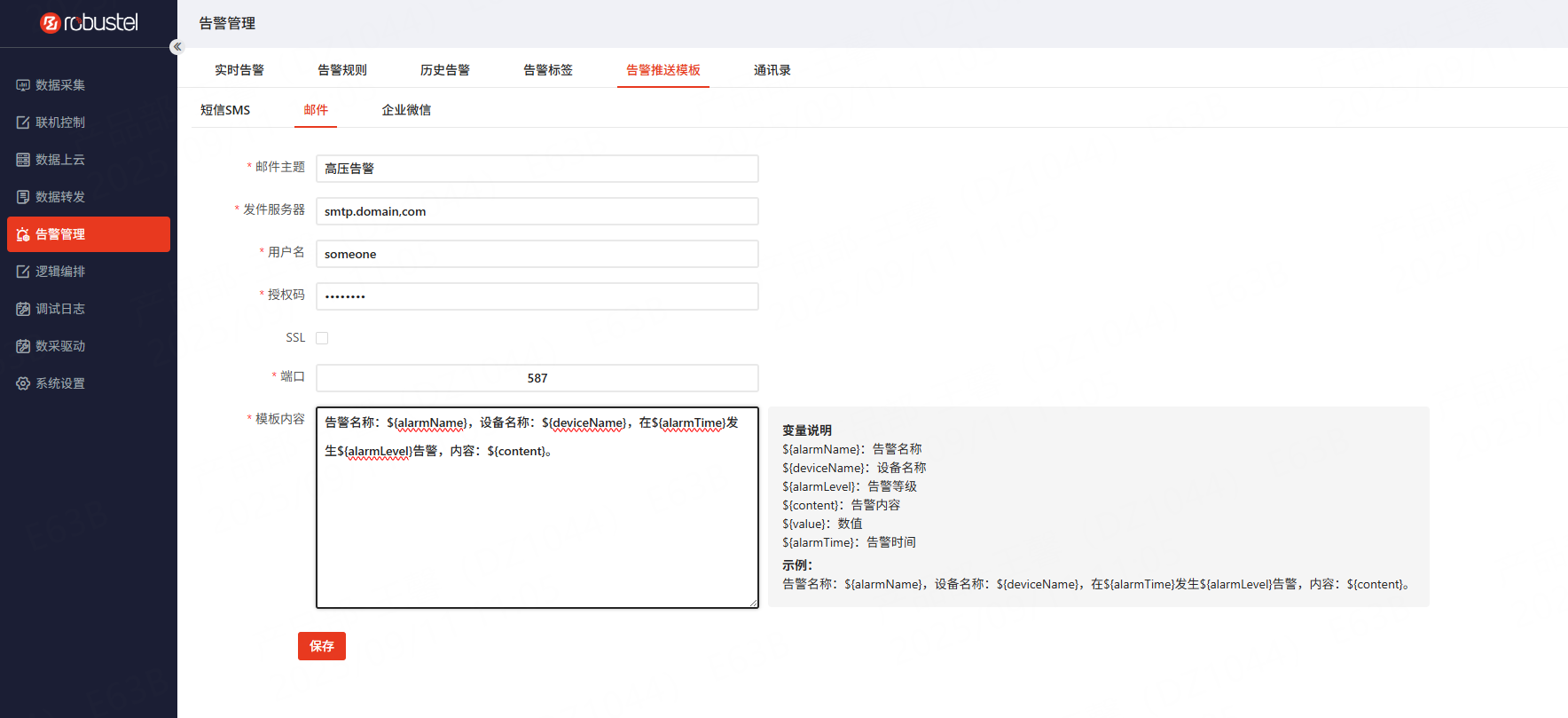 在告警管理页面中,选择告警推送模板 - 邮件标签页,可配置邮件服务器以及告警信息的模板内容。