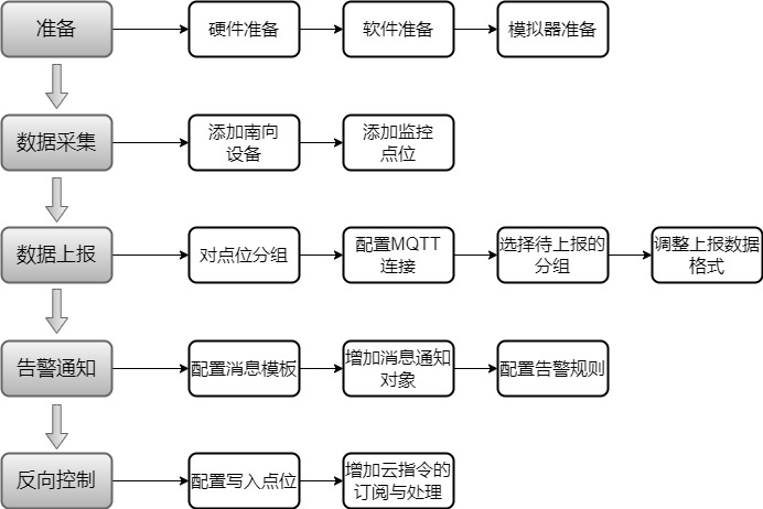 为了让用户有一个更加直观、清晰的认识,我们采用一个“基于Modbus TCP模拟设备的数据采集与反向控制”的实际例子引导用户逐步上手,便于快速理解软件的核心功能以及常用配置方法。