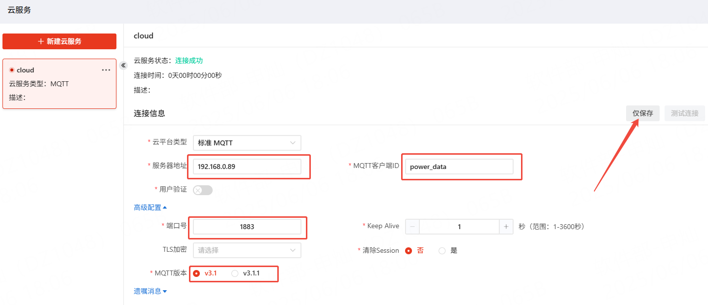 配置完成并保存后,可以点击测试连接,稍等片刻后可查看云服务状态是否变更为连接成功。否则请检查配置信息是否有误,MQTT Broker服务器是否正常,或者服务器的防火墙是否开启并阻止了1883端口的流量。