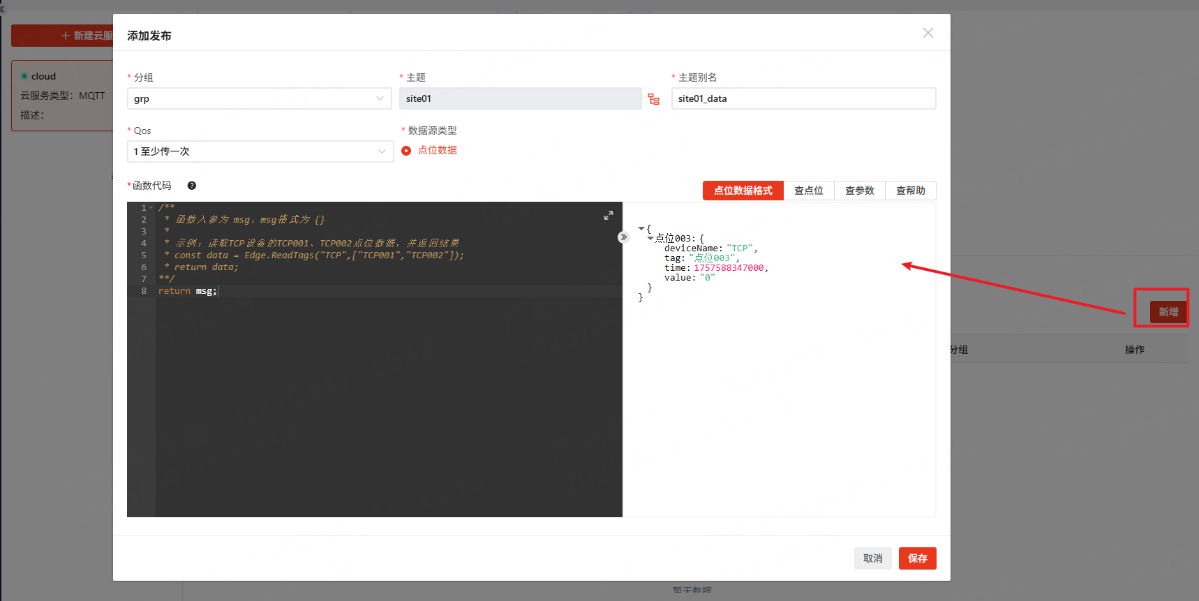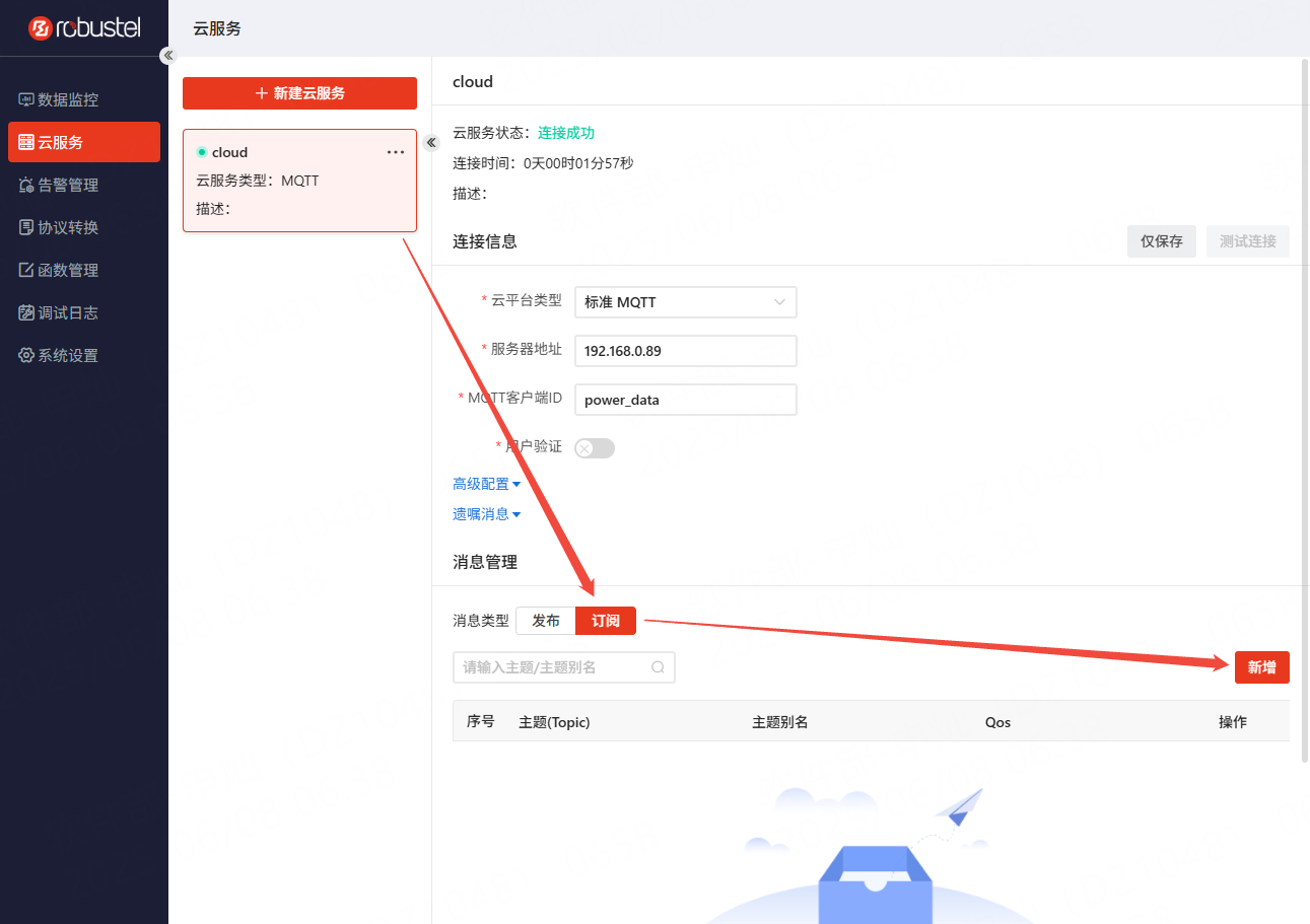 连接成功后,可以添加具体需要上传的数据组以及对应的topic。