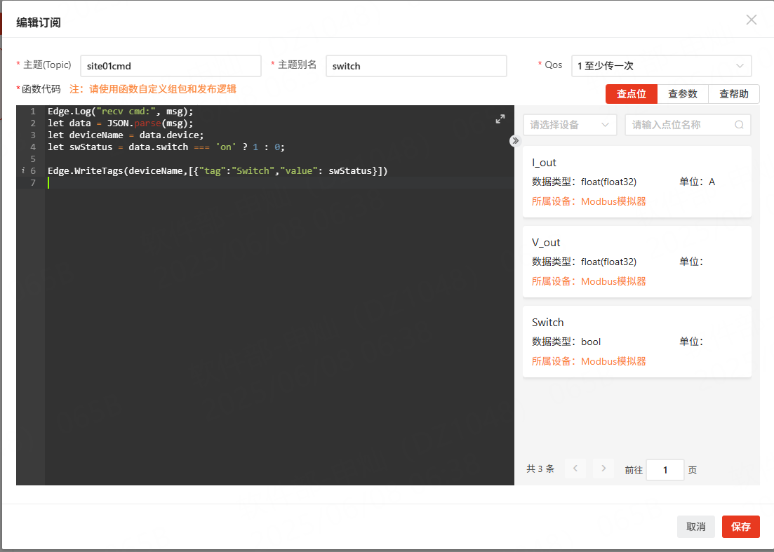 为了让网关在接收到指令后能触发相应的动作(写入Modbus寄存器),可以在函数代码对话框中加入如下的代码。