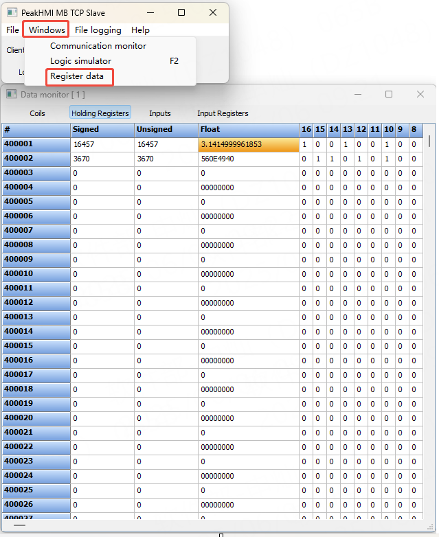 本示例使用PeakHMI MB TCP Slave作为Modbus TCP Slave的模拟器,用户可自行在PeakHMI官网下载安装。