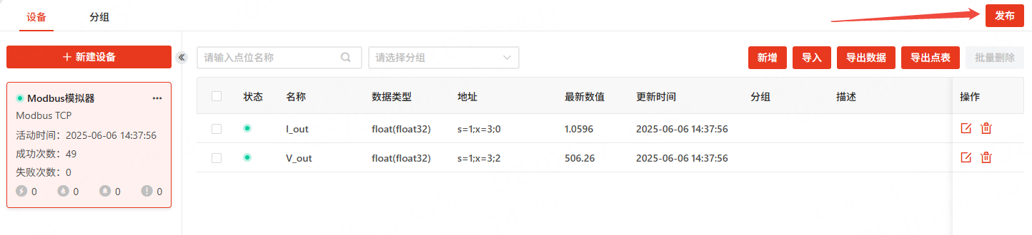 添加完成后,点击发布,稍等片刻(1个轮询周期左右),可在点表列表页面中看到各个点表采集到的最新数值。如下图所示: