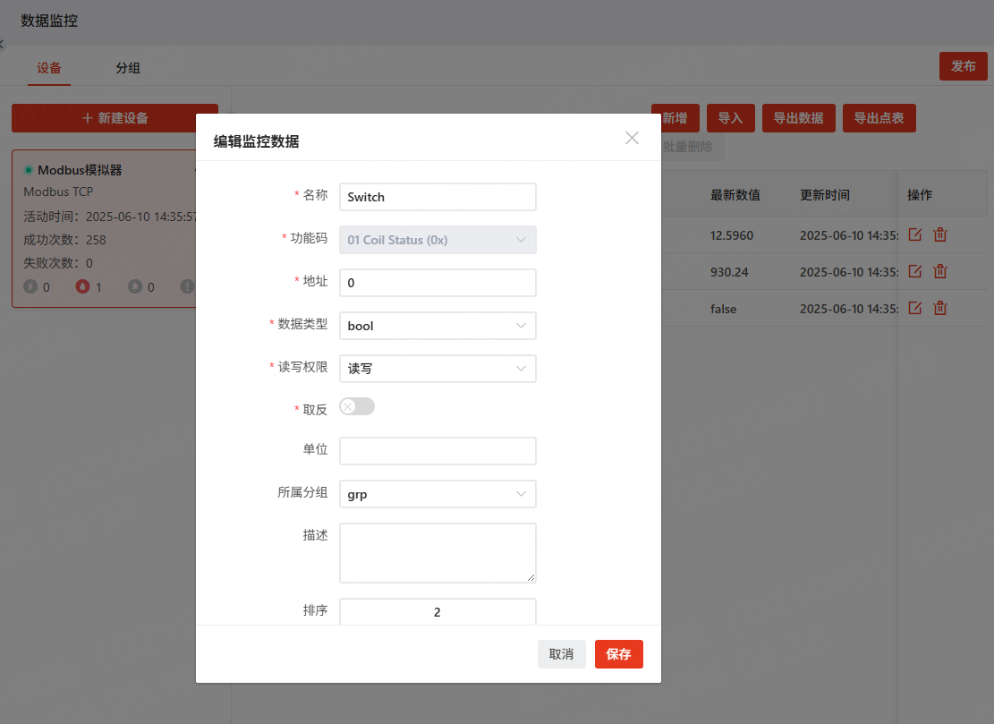 为了能够更好的观察指令处理的结果,我们可以在数据采集的Modbus模拟器设备中增加一个名为Switch,功能码为01 Coil Status,地址为0,可读写的点表,便于通过云指令进行状态更改。