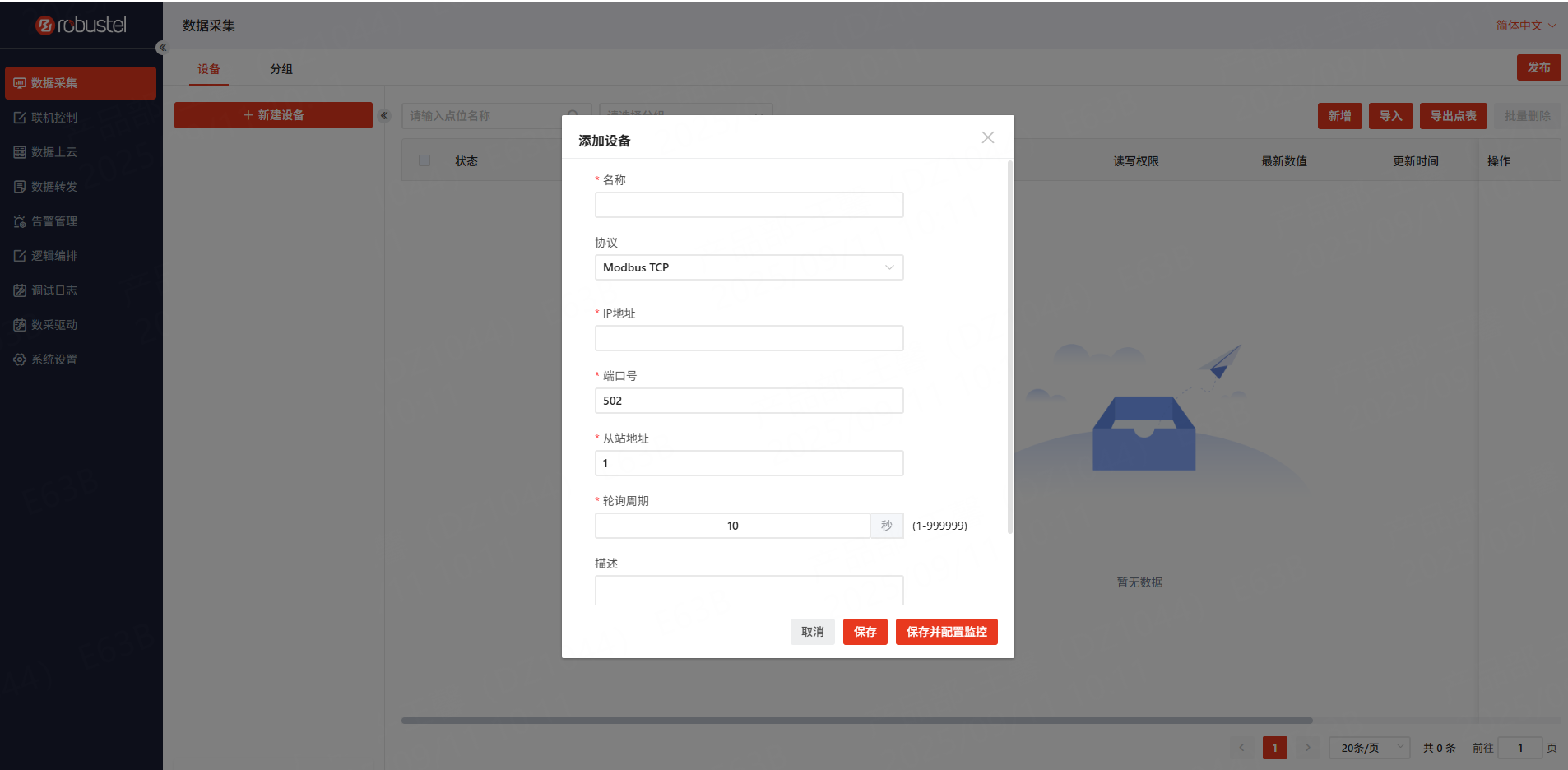 选择数据采集页面,点击新建设备按钮,弹出如下所示的对话框