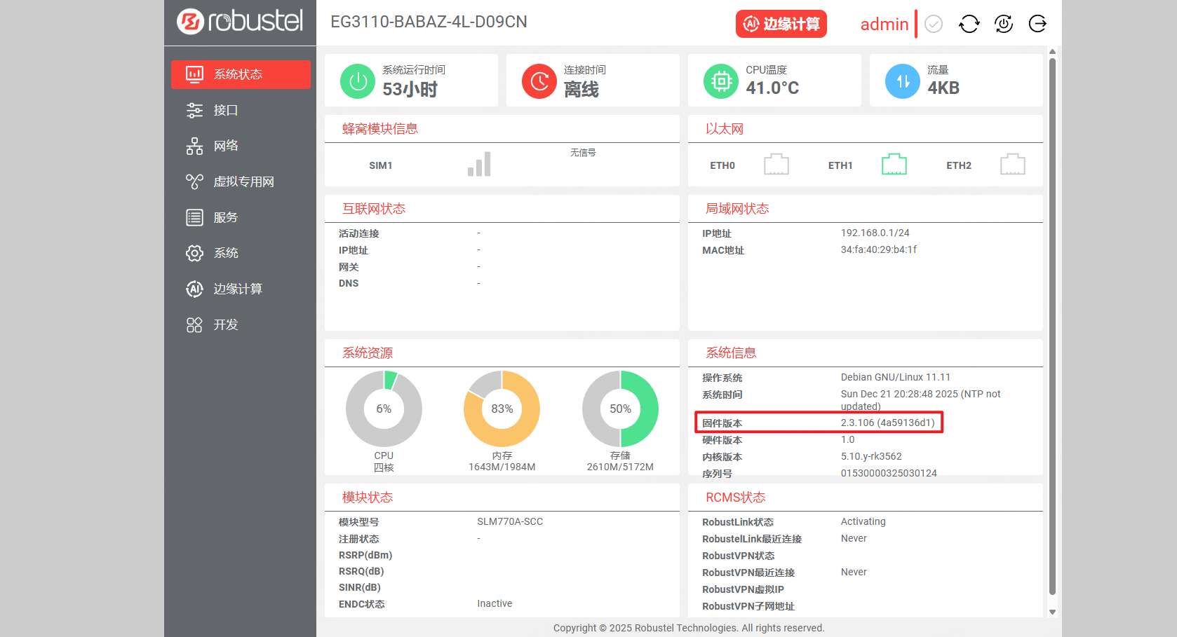 可从网关WEB首页中查看到固件版本信息,如下图所示: