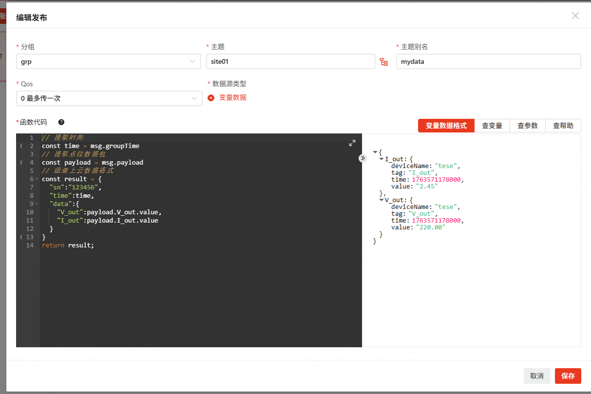 点击保存后,可以通过MQTT客户端观察发布到MQTT上的数据是否发生了变化,正常情况下,应该出现如下格式的消息: