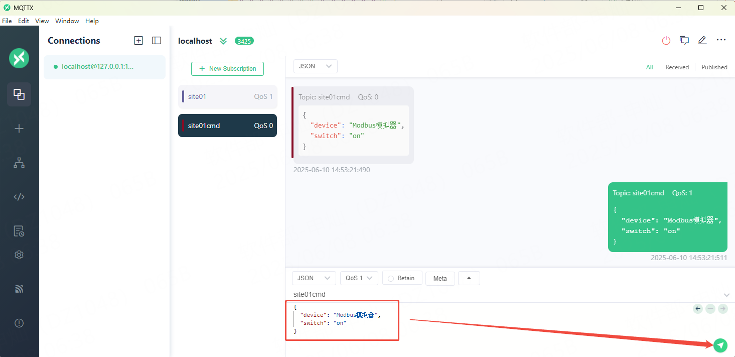 在完成上述配置后,我们就可以通过MQTTX向site01cmd的topic发送指令了。
