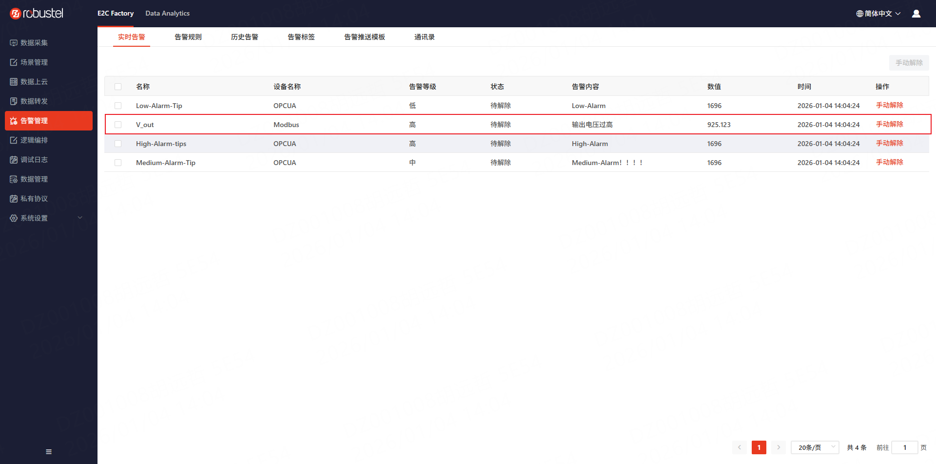 按照上图所示,我们添加一个输出电压V_out大于920伏的告警规则。此时我们修改模拟器中的V_out为925.125(可以是大于920的任意值),稍等片刻,我们在实时告警中应该可以看到出现了一条高压告警的信息。