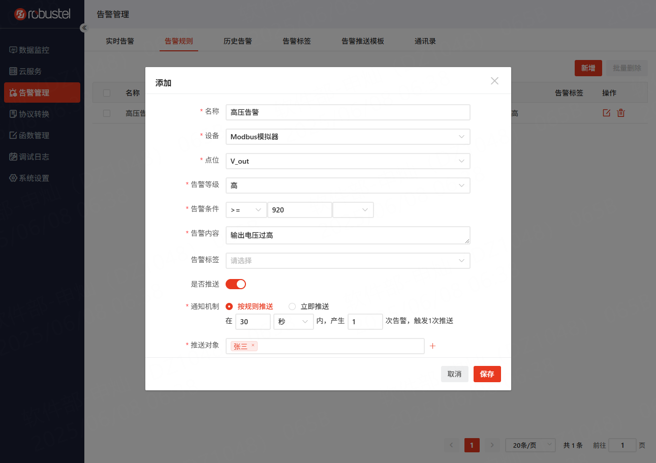 现在我们希望对采集的电压值进行阈值判断,当电压值大于920伏的时候,系统应触发高压告警,同时通过邮件的方式将告警信息通知到预先设定的用户邮箱中。