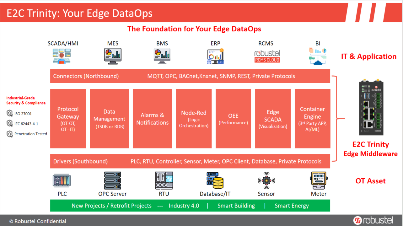 在中间,E2C Trinity 作为核心引擎,处理协议转换、边缘数据管理、逻辑运算、实时报警、边缘Web SCADA和设备OEE,甚至是 AI 计算,是一个全栈式边缘平台。