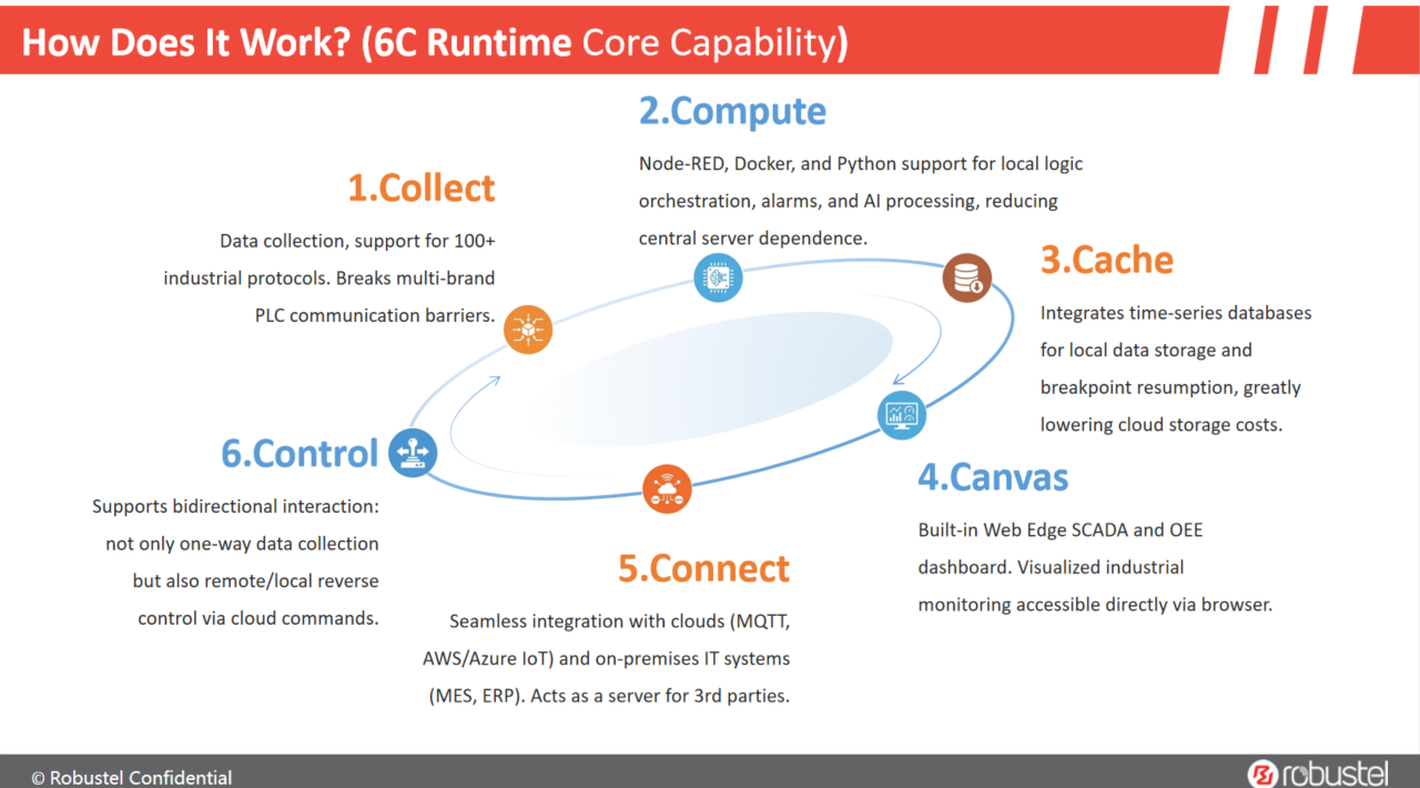 ● 技术底座:运行于 Edge Runtime (RobustOS Pro)。基于标准的 Debian Linux 操作系统,具备工业级的稳定性、高度的软件灵活性和全球认可的安全合规性(如 IEC 62443)