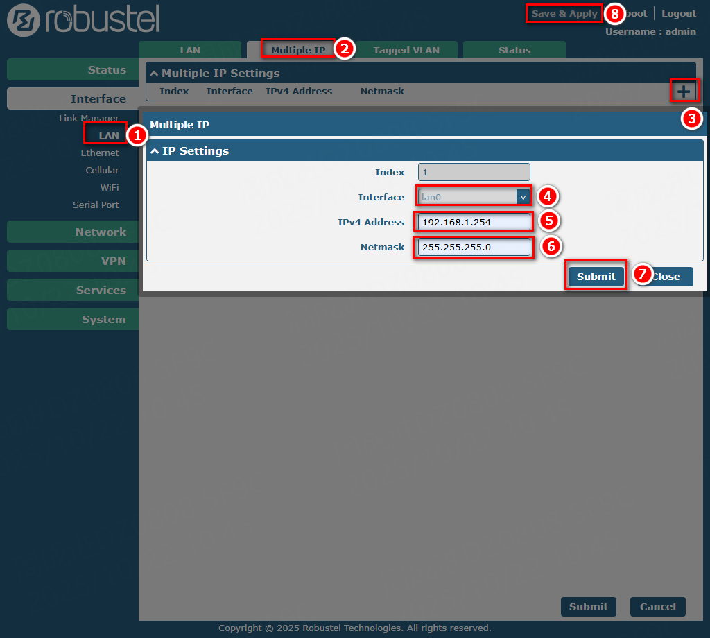 This guide explains how to add a secondary IP address to a LAN interface on a Robustel router running RobustOS. This configuration is primarily used to enable communication with terminal devices on a different IP subnet without altering the router's default LAN IP address. By adding multiple IPs, the router can effectively have a presence on several logical networks through a single physical LAN interface, simplifying network integration.