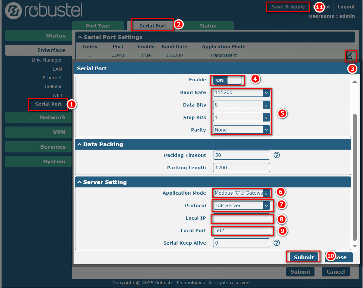 - Navigate to Interface -> Serial Port in the router's web interface.