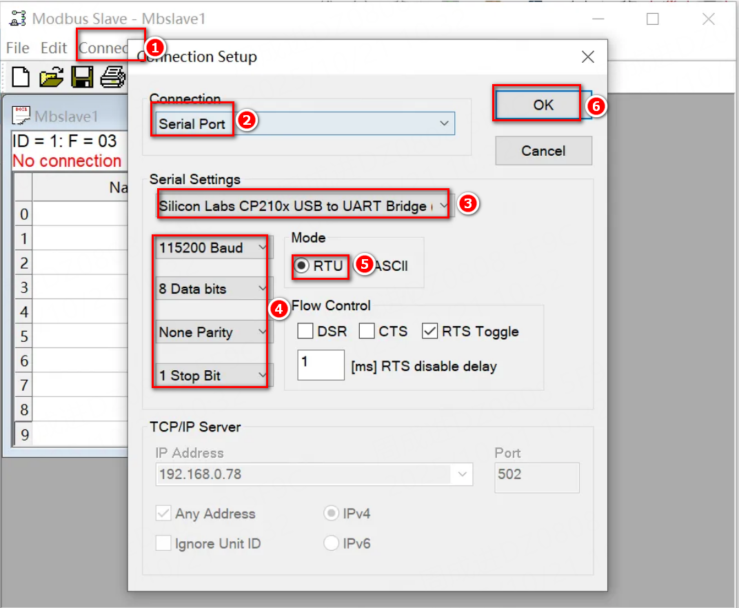 - Modbus Slave will simulate the RTU device connected to the router's serial port.