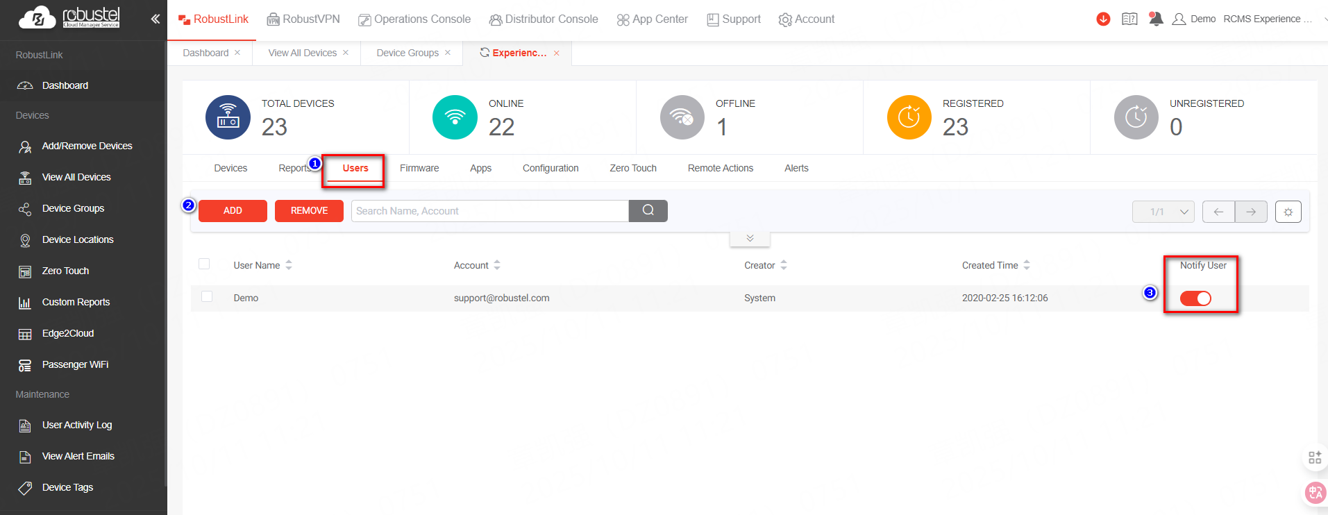 This guide explains how to configure email alerts within the Robustel Cloud Manager Service (RCMS). Users who have already configured their SMTP server settings but are still not receiving email notifications for device alerts (such as online/offline status changes) will find the solution here. The final, critical step is to enable notifications for specific users within the device group where the target devices are managed.