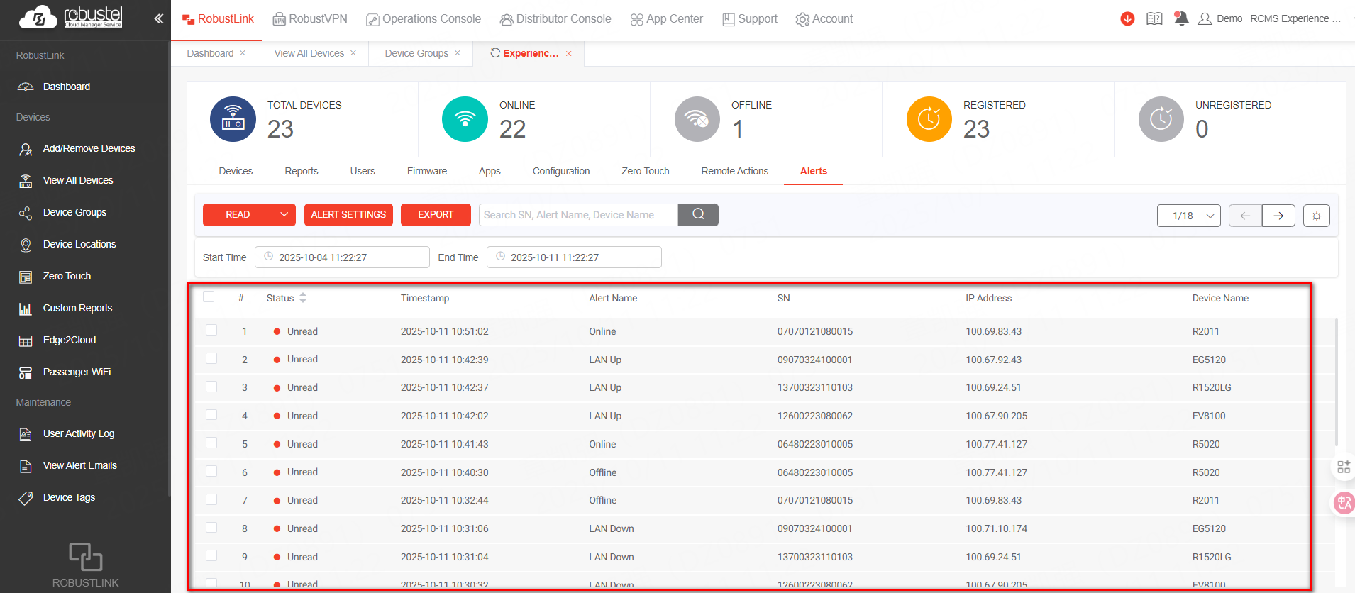 - Trigger a Test Alert: The easiest way to test is to trigger a standard alert. For example, you can power off one of the gateways in the configured device group. After a few minutes, RCMS will register the device as offline and generate an alert.