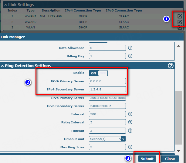 ● Check if Ping Detection is Enabled: Verify that the Ping Detection function is enabled for both WWAN1 and WWAN2.