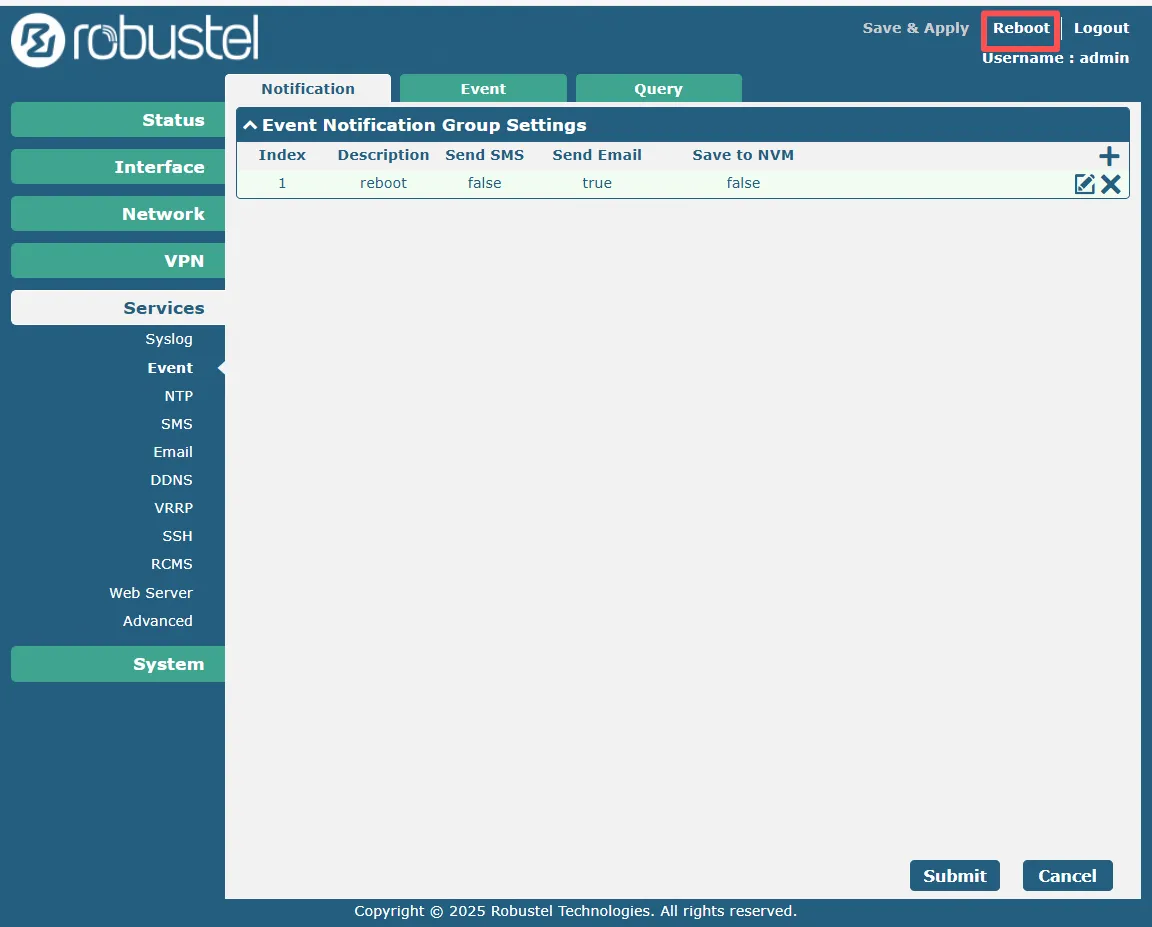 - Since the trigger event is System Reboot, simply click the Reboot button located in the top-right corner of the web interface.