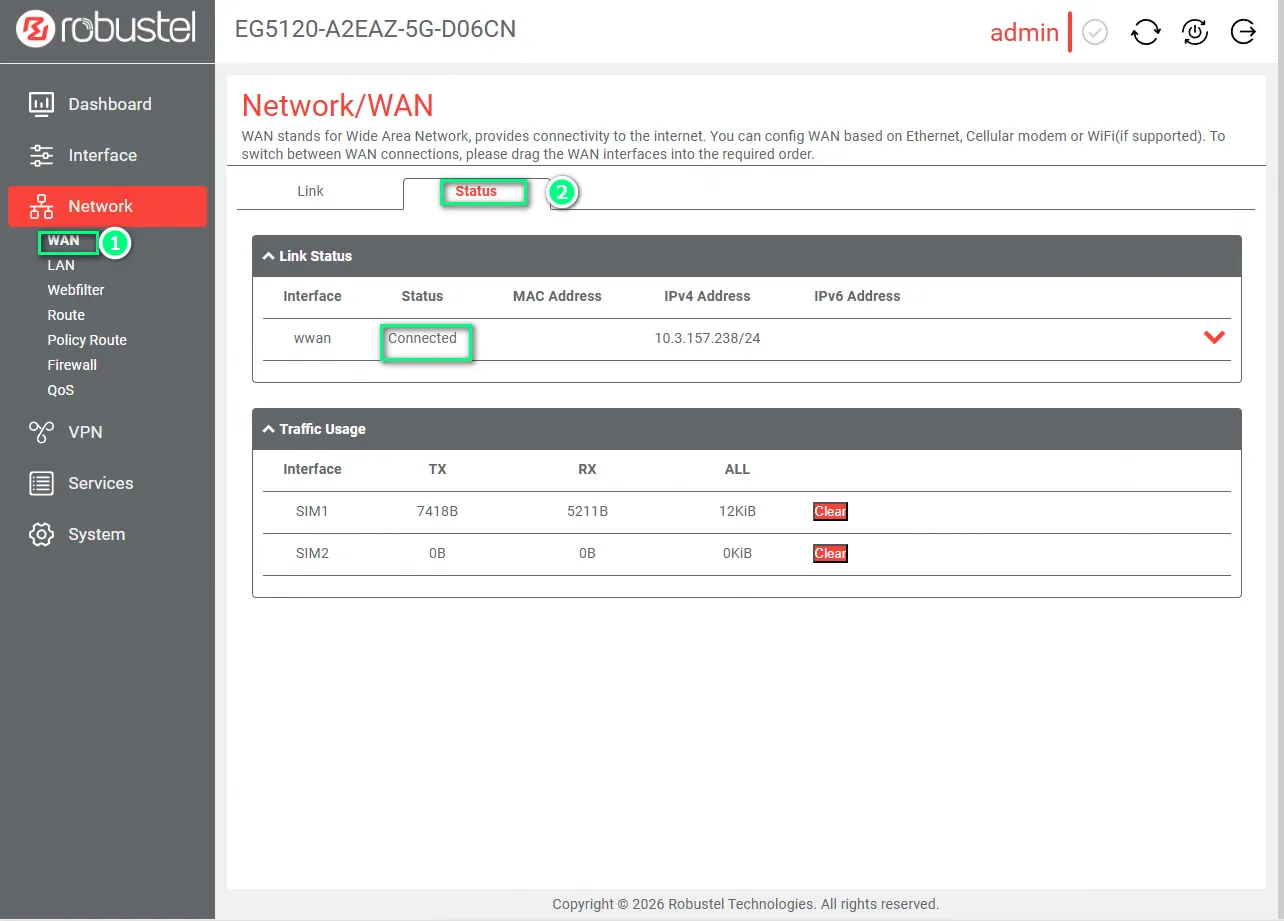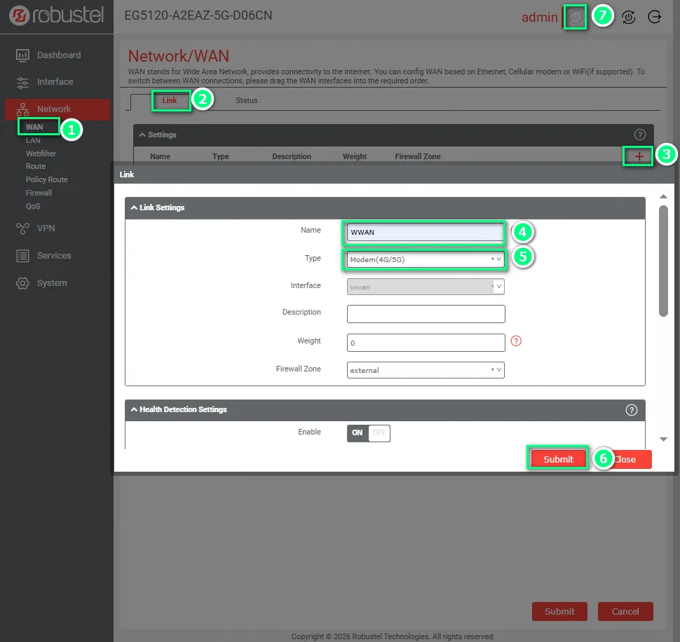 📝 Note: By default, Robustel gateways are factory-configured to automatically detect and dial-up cellular connections. Manual link creation is only required if the default configuration has been deleted or modified.