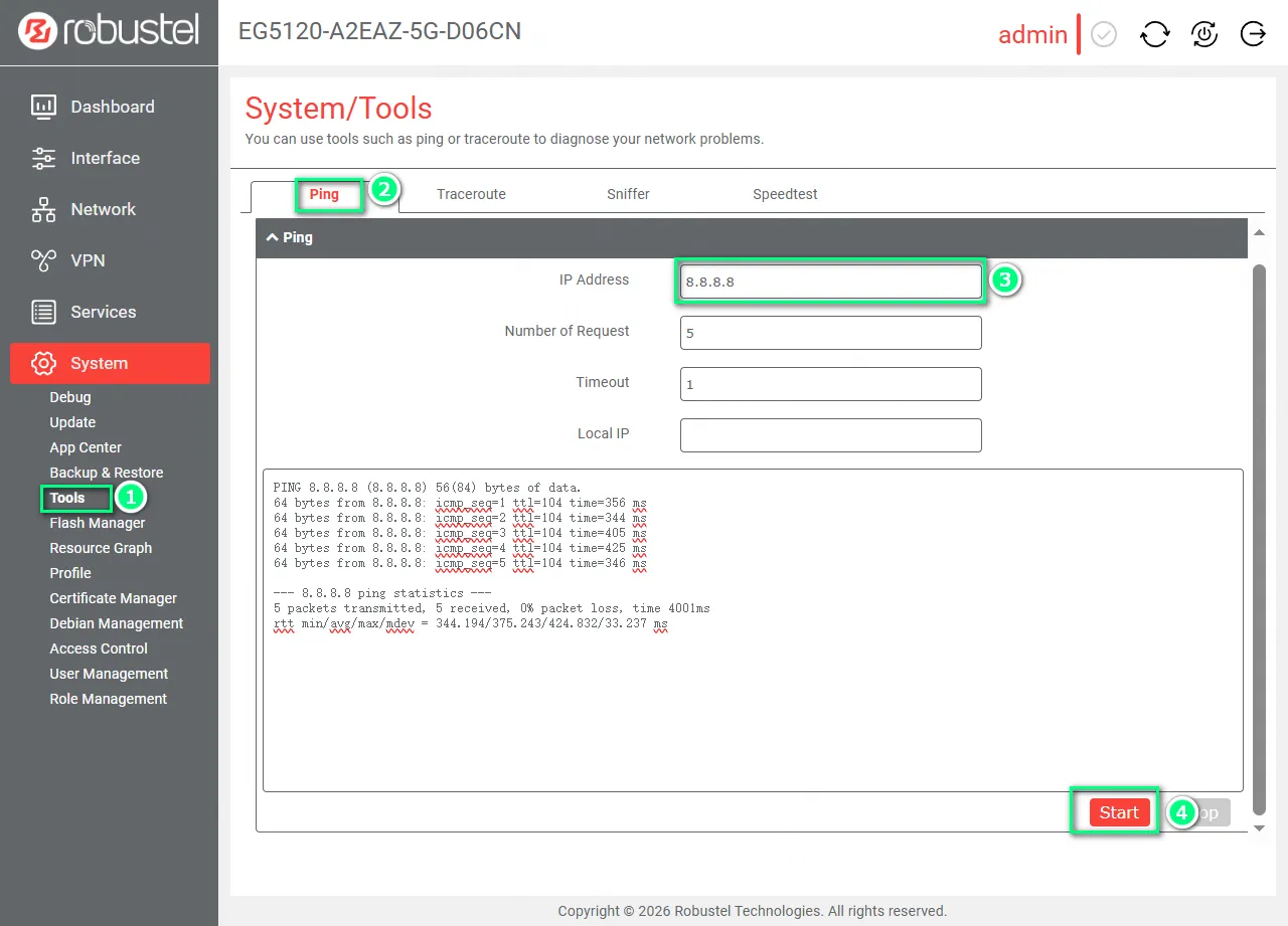 Navigate to System -> Tools. In the Ping section, enter 8.8.8.8 in the IP Address field and click Start.