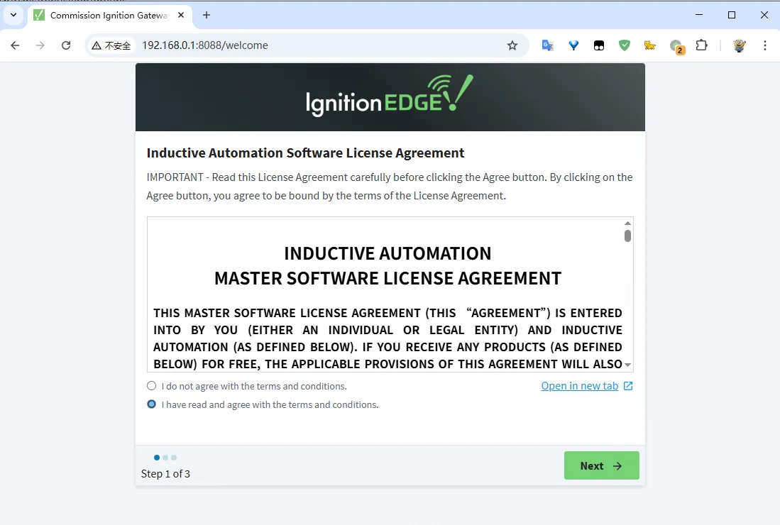 http://<EG5120_IP_ADDRESS>:8088 - You should now see the Ignition Edge "Commissioning" welcome screen.