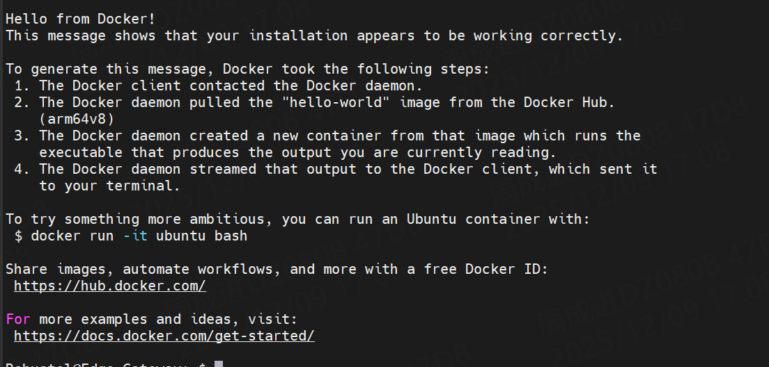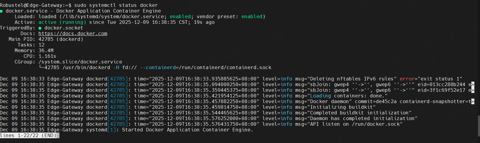 https://download.docker.com/linux/debian/dists/bullseye/pool/stable/arm64/arm64 for EG series)..deb files to the gateway.sudo dpkg -i package_name.debAfter installation, it is critical to verify that the Docker service is active and capable of running containers.