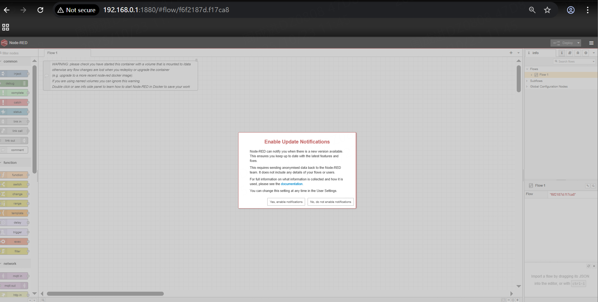 192.168.0.1 with your gateway's actual LAN IP):✅ Success: The Node-RED flow editor interface should load.