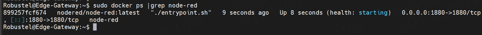 sudo docker ps | grep node-red✅ Success: You should see an entry with a Container ID, Status "Up", and the port mapping 0.0.0.0:1880->1880/tcp.