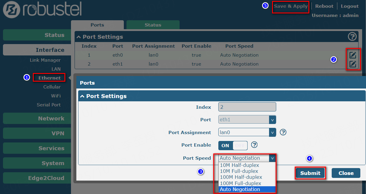 By default, the Ethernet ports on the gateway are set to "Auto-Negotiation" mode to automatically match the optimal speed and duplex mode of the connected device. However, in certain specific scenarios (e.g., when connecting to legacy network equipment or when performance optimization is required), it may be necessary to manually specify the port's speed and duplex mode. This document will guide you through the process of manually modifying the connection parameters of a specified Ethernet port via the Web management interface.