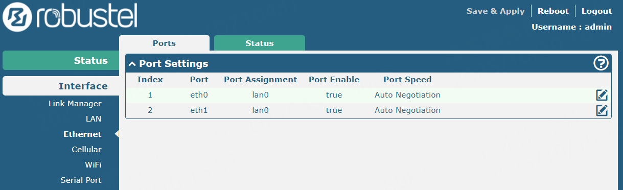 In the "Port Settings" overview table, locate the port you need to modify (for example, port eth1with index 2 as shown in the figure). Click the Edit (Pencil) icon on the far right of that port's row. The detailed "Port Settings" configuration panel below will load the current configuration for this port.