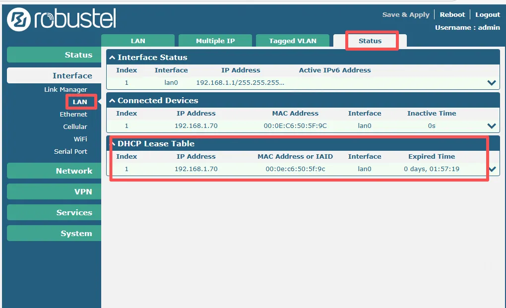 - Check DHCP Lease Table: On the router's web interface, navigate to Interface -> LAN and click on the Status tab. In the DHCP Lease Table, you should see your connected PC listed with an IP address that falls within the new scope you defined (e.g., between
