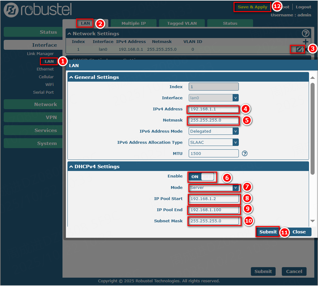 lan0) and click the edit icon on the right. - A configuration window will pop up. Configure the following settings: