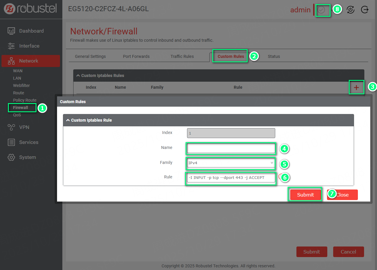 This guide will walk you through adding a custom iptables firewall rule to open a specific port (using TCP 443 for HTTPS web access as an example) on the gateway's INPUT chain.
