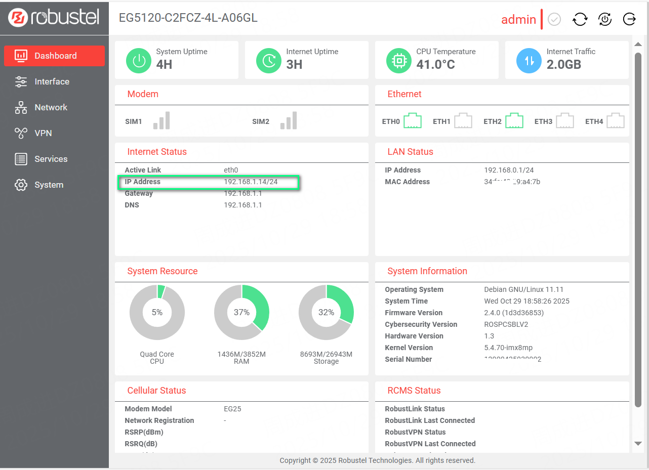 - 1 x Robustel Gateway running RobustOS Pro (e.g., EG5120, EG5200)