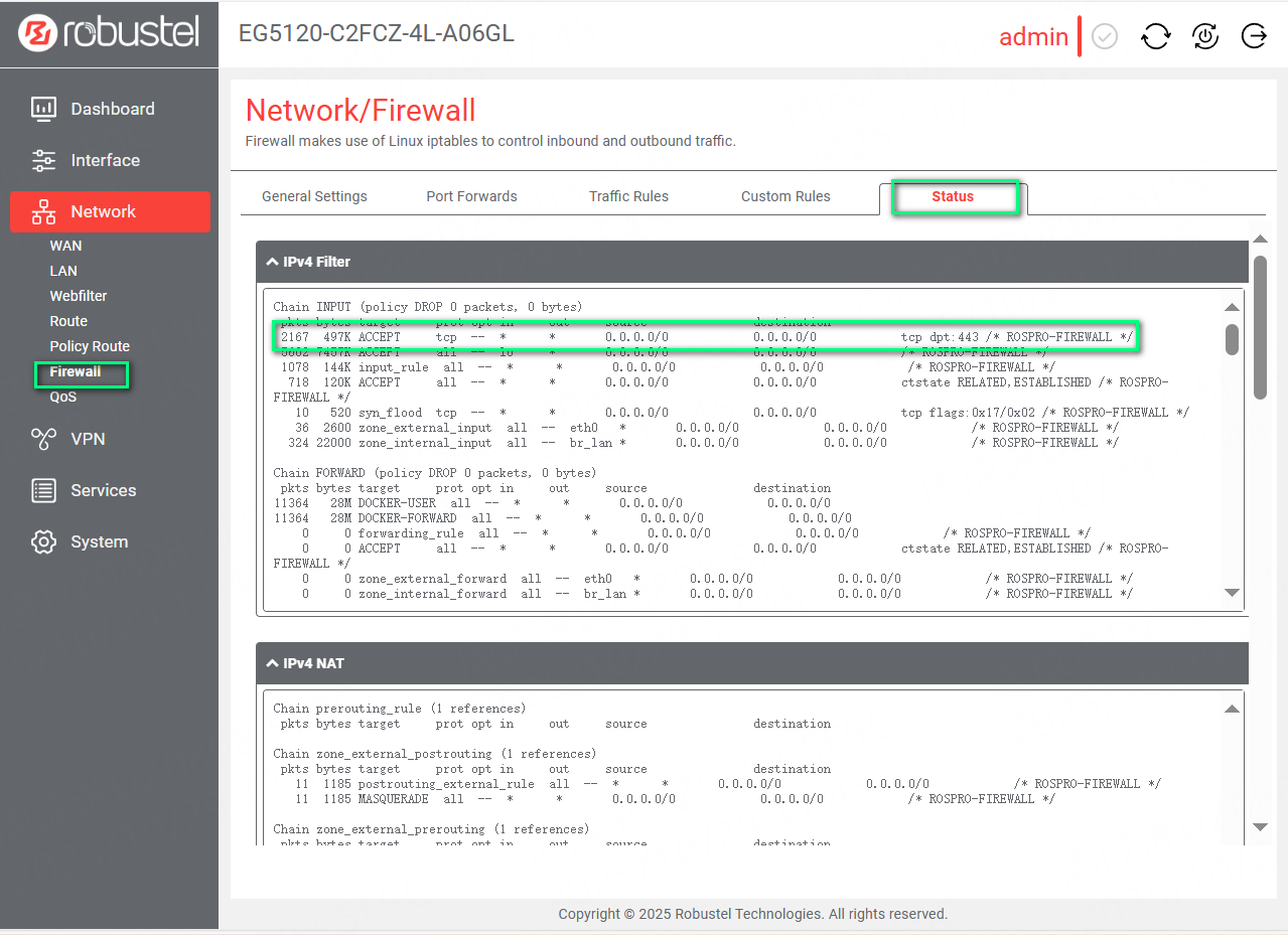netstat command to check. For example, to check TCP ports, use netstat -tln. For UDP ports, use netstat -uln. Ensure the port you need to access is in the output list (e.g., tcp 0 0 0.0.0.0:443 0.0.0.0:* LISTEN). - Is the firewall rule active? Go to Network -> Firewall -> Status to confirm your