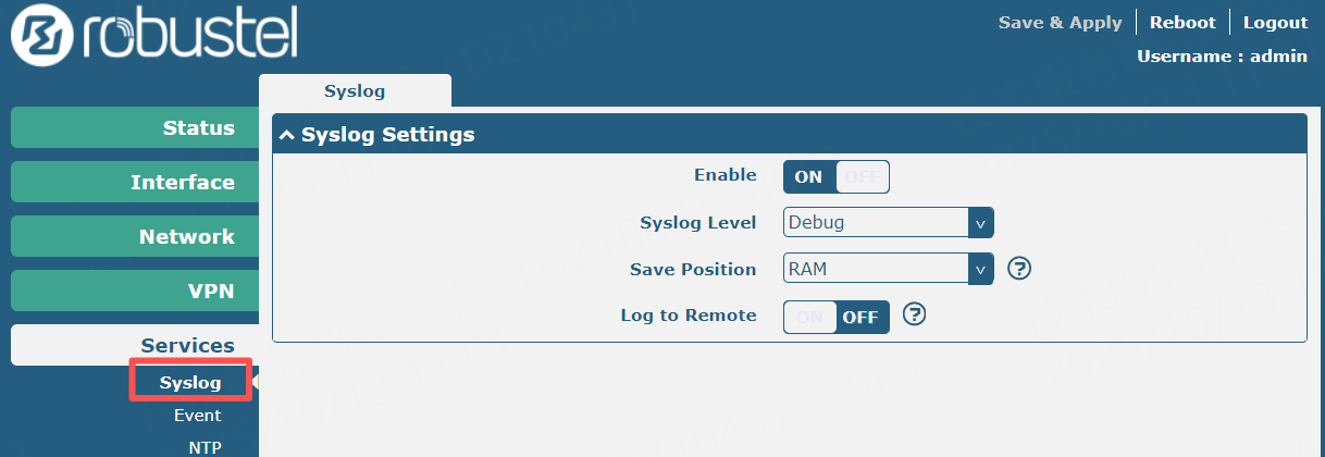 192.168.0.1). - In the left-hand dark blue navigation bar, click 【Services】 to expand the menu, then select 【SysLog】. The log configuration area will be displayed on the right.
