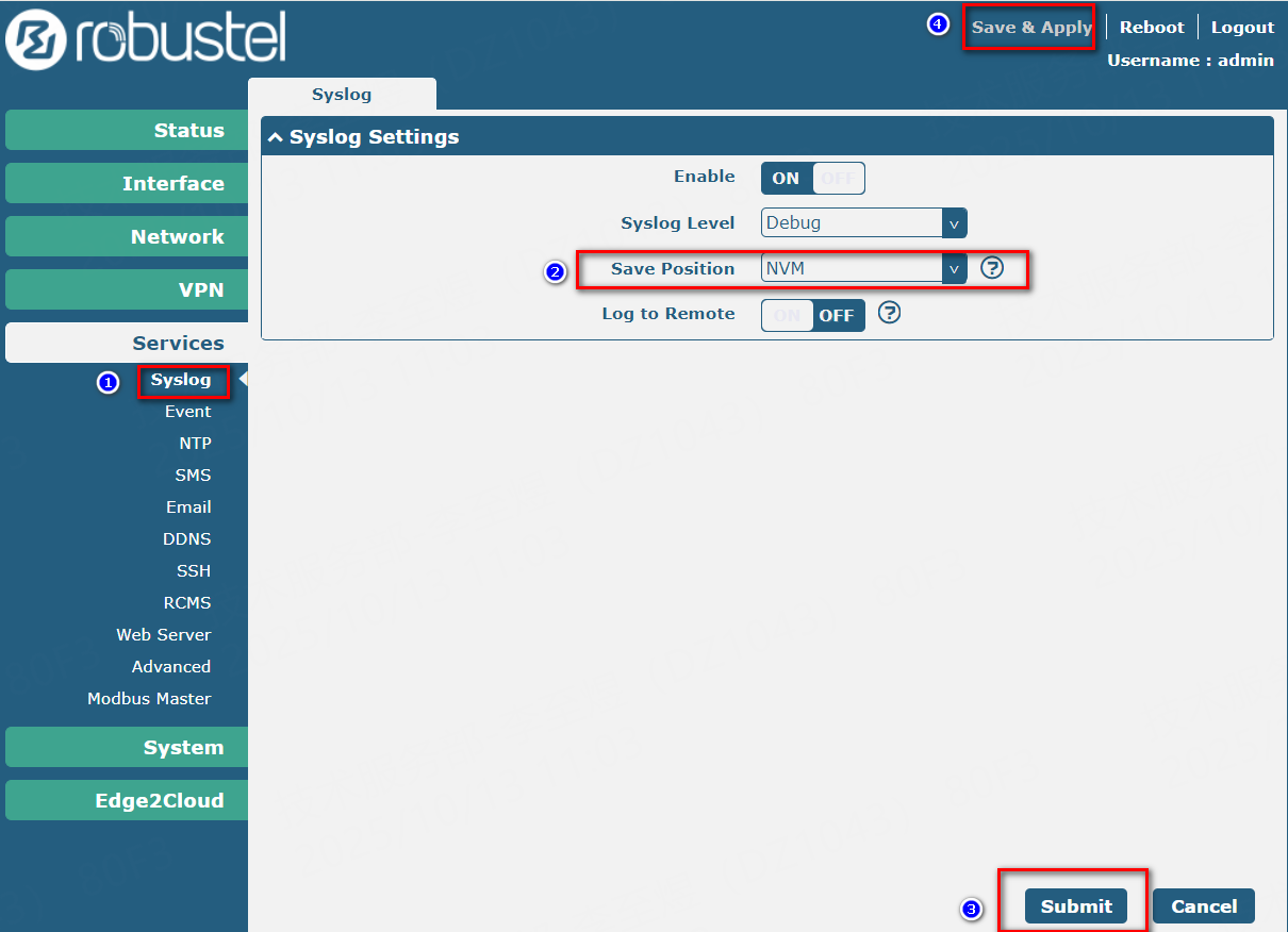 By default, gateway system logs may be stored in RAM (memory), which means the content is lost after a power cycle. Configuring the log save location to NVM (Non-Volatile Memory) ensures that system logs are retained persistently across gateway reboots or power outages, facilitating subsequent troubleshooting and system analysis. This document guides you through the steps to configure log saving to NVM.
