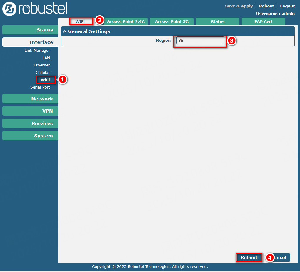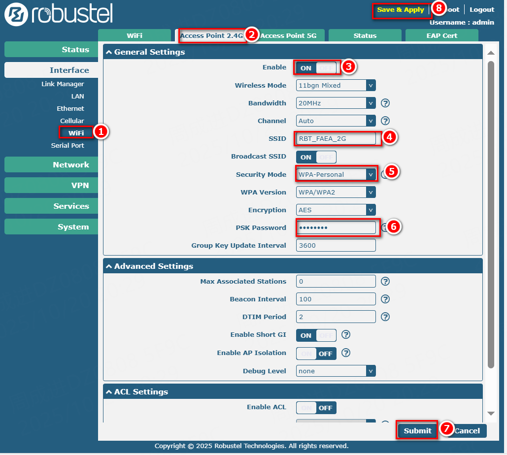 This guide provides step-by-step instructions on how to configure your Robustel gateway to function as a Wi-Fi Access Point (AP). This setup allows you to create a local wireless network, enabling devices such as laptops, smartphones, and tablets to connect to the gateway and access the internet through its cellular (WWAN) or wired (WAN) connection. This is ideal for scenarios requiring a portable Wi-Fi hotspot in a vehicle, at a temporary job site, or in any location where a primary internet connection needs to be shared wirelessly.