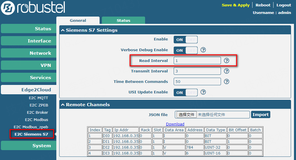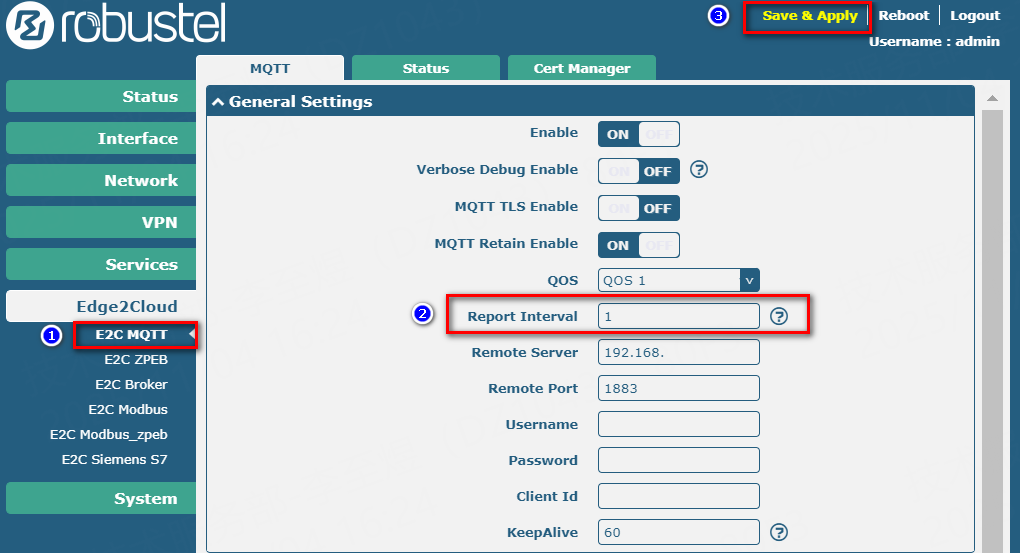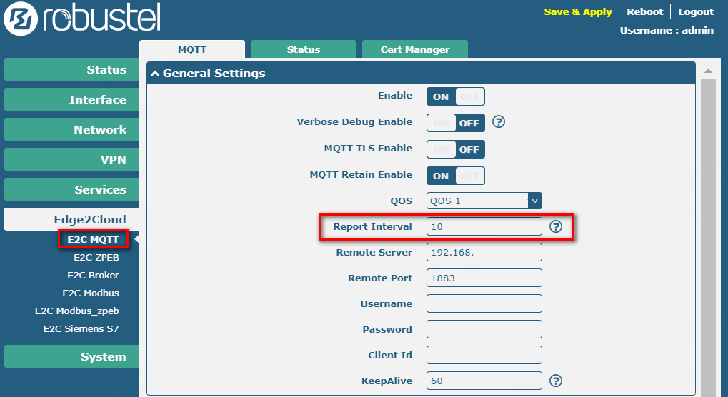 Note the upload cycle in Edge2Cloud -> E2C MQTT -> Report Interval. Currently set to 10 seconds