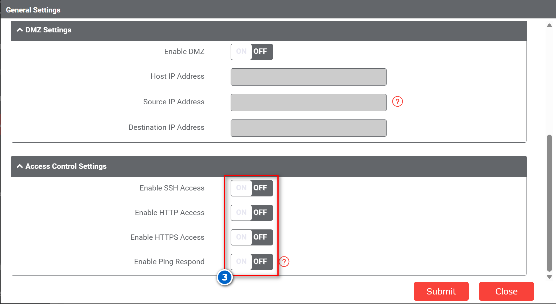 6. Disable access for all listed protocols (SSH, HTTP, HTTPS, and Ping) to ensure no general remote access is allowed.