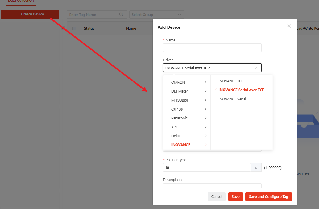 Select the communication driver; select "Inovance - Serial over TCP". |