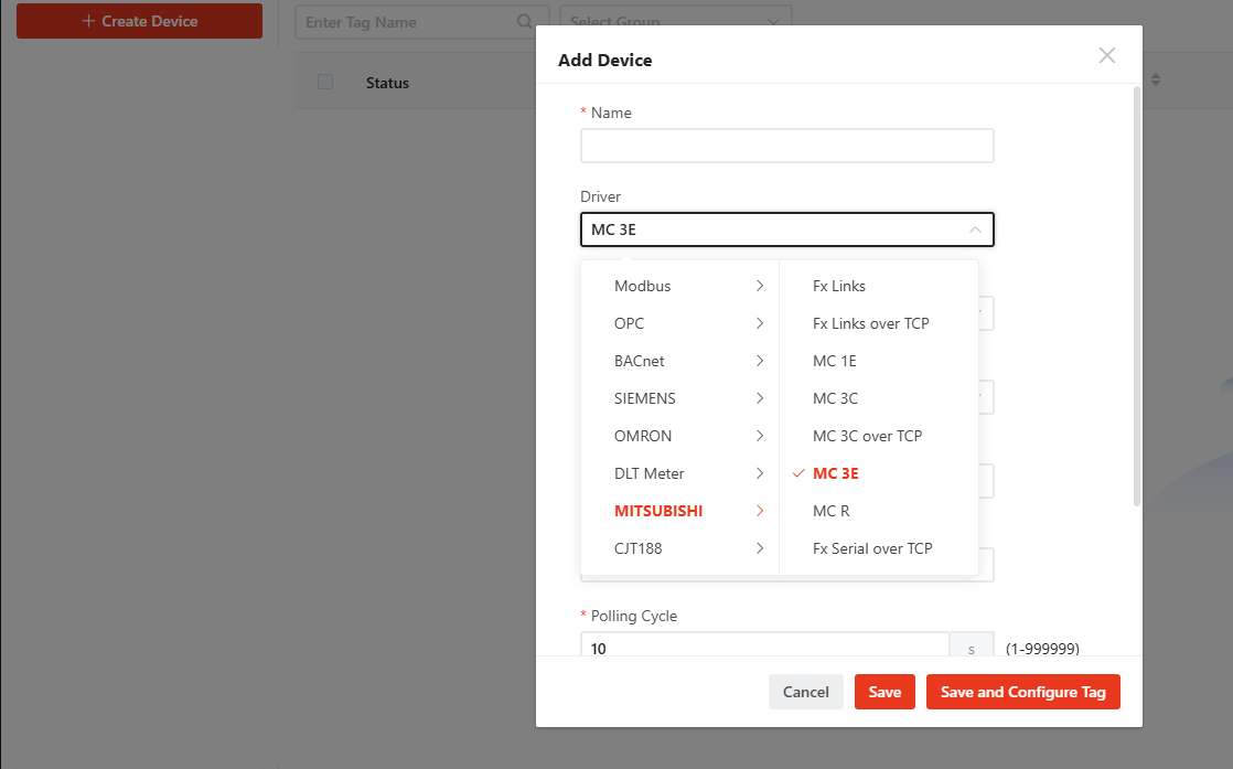 Select [MITSUBISHI] -> [MC 3E] from the dropdown list. |