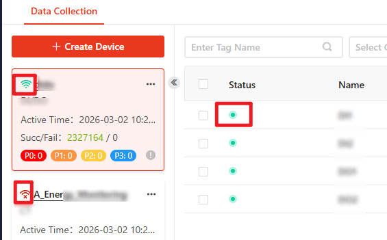 - Check the device list to ensure the status is Online and tags are successfully collected.A green icon indicates success, and a red icon indicates failure.