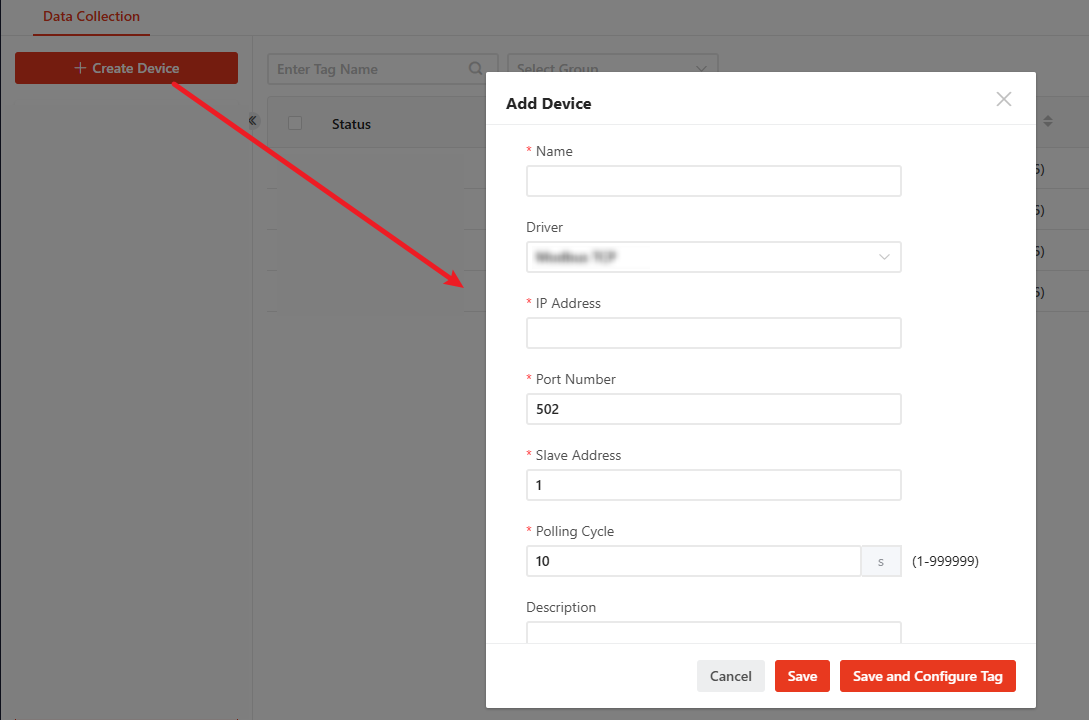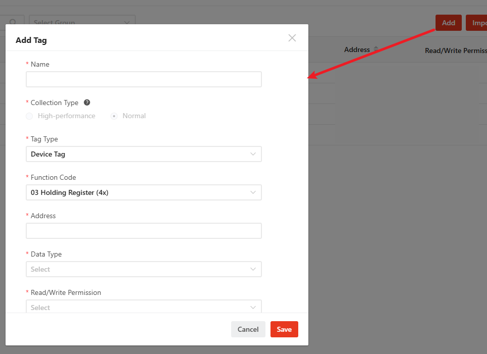 - Click "Add" to create a single data acquisition Tag. Fill in the tag information.
