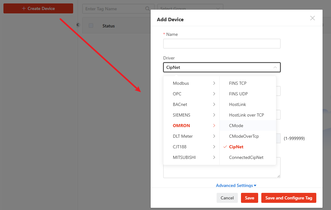 | Driver | Communication protocol; select [OMRON] - [CipNet] from the dropdown list. | OMRON - CipNet |