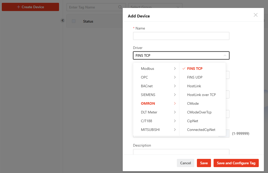 Select [OMRON] - [FINS TCP] from the dropdown list. |