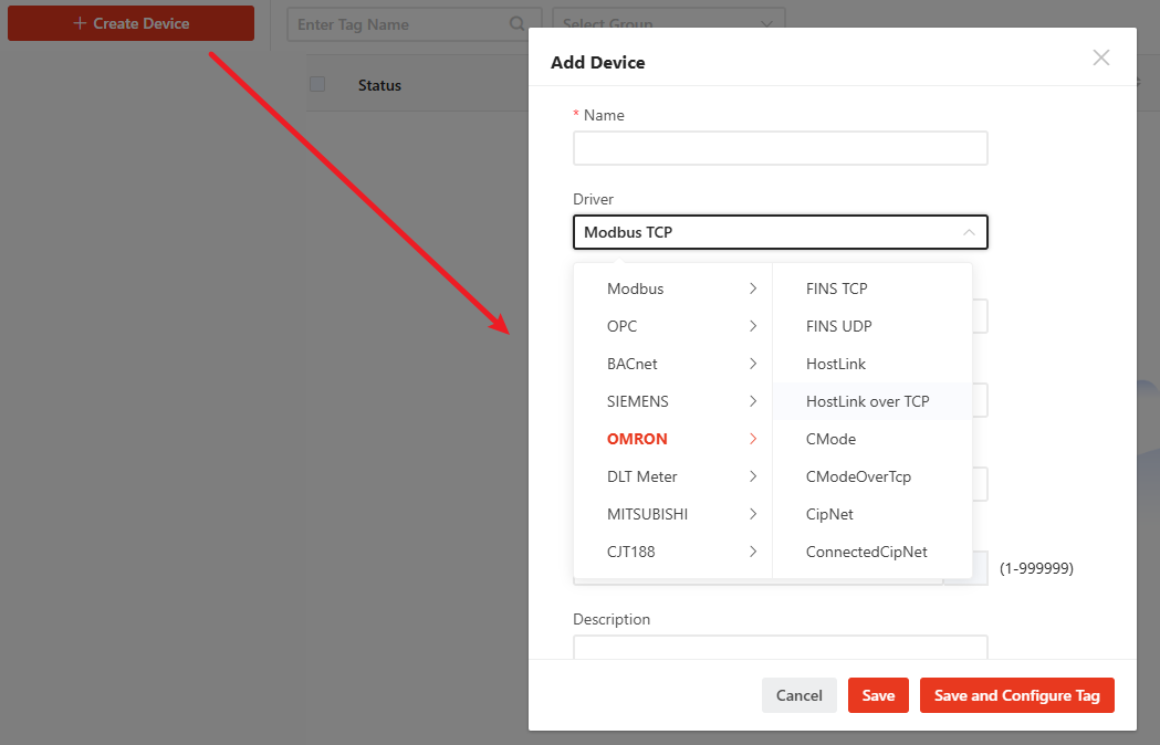 Select [OMRON] - [HostLink over TCP] from the dropdown list. |