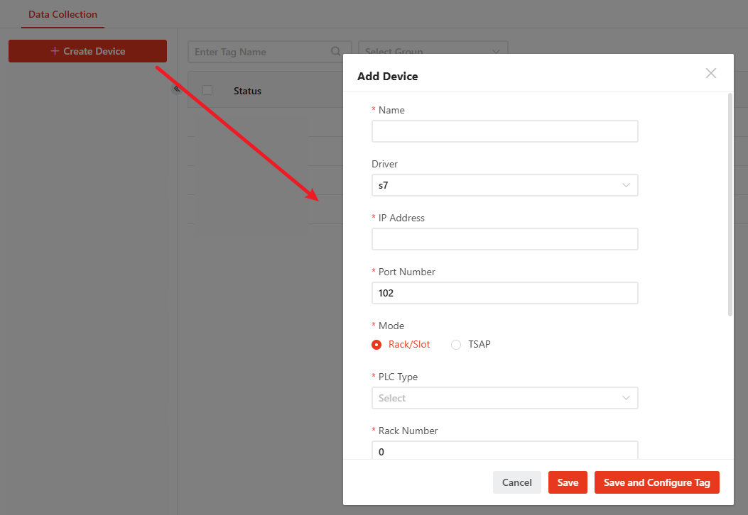 - Click the "Create Device"button and fill in the connection information in the pop-up window.
